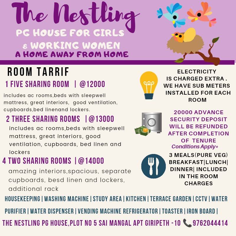 The Nestling P G house for Girls is run with the primary objective of providing the Girls & Working Women “Home away from home” where they can feel at ease and put in their best. It has a magnificently designed PG House for Girls, with all modern facilities, for boarding and other recreational activities. All rooms are equipped with air conditioners , television, comfortable Sleepwell Matteress With beds , cupboards,beautiful cotton bed linen ... View More